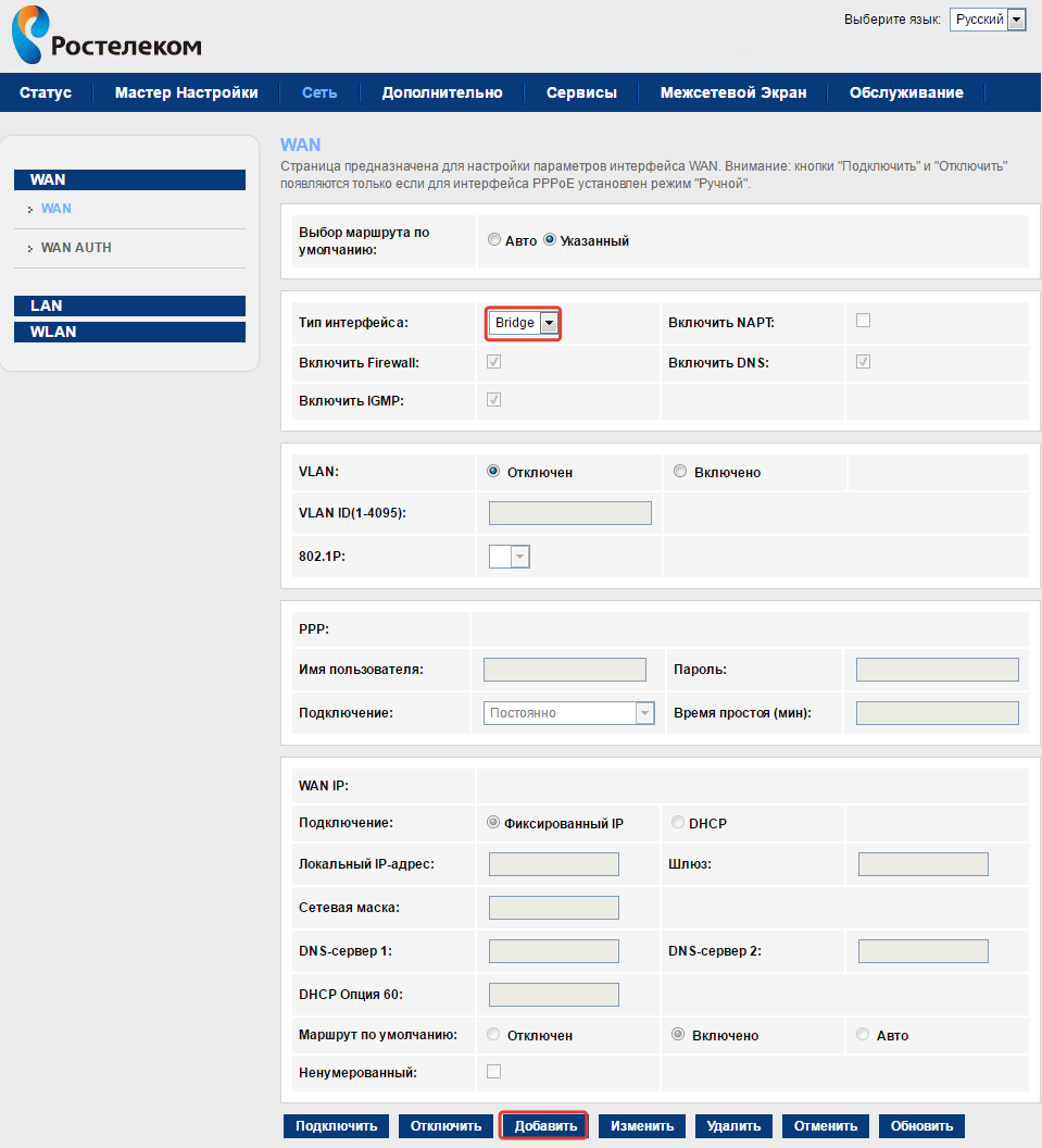 Далее, добавляем подключение как Мост для работы услуг IPTV