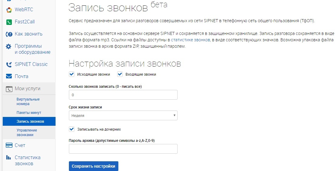 Обратите внимание: если Вы установитепароль архива и забудете его, то записи для Вас будут утеряны. Максимальный срок хранения записей звонков на сервере Sipnet — 3 месяца