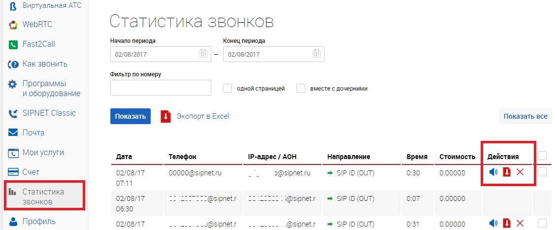 Прослушать/скачать/удалить записи Вы можете в разделеСтатистика звонков в личном кабинете.