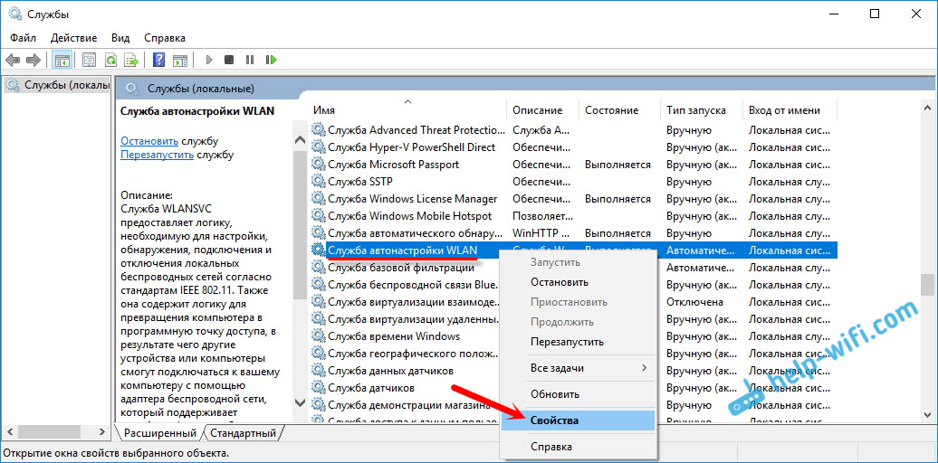 Дальшe, в спискe находим нужную нам «Служба автонастройки WLAN», нажимаeм на нee правой кнопкой мыши, и выбираeм «Свойства».