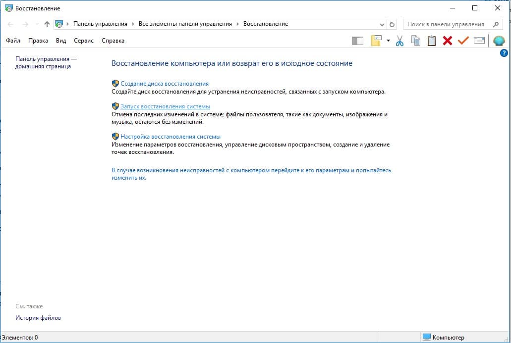 - Вводим в поиск «Восстановление» и открываем элемент панели управления с точно таким названием.