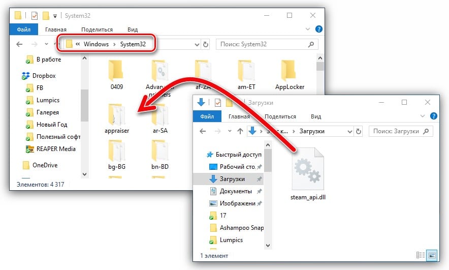 Первое, что приходит в голову — скачать steam_api.dll и система снова сможет работать. На самом деле не всегда это срабатывает, но попробовать стоит. Здесь важны несколько нюансов: скачать подходящий файл (с нужной разярдностью и не зараженный вирусом), положить его в правильное место и зарегистрировать в системе. Все это мы сделаем в рамках следующей инструкции.