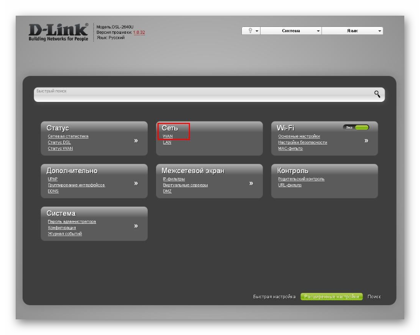 В интерфейсе роутера dsl 2640u настройка Ростелеком осуществляется во вкладке «Сеть» — «WAN».
