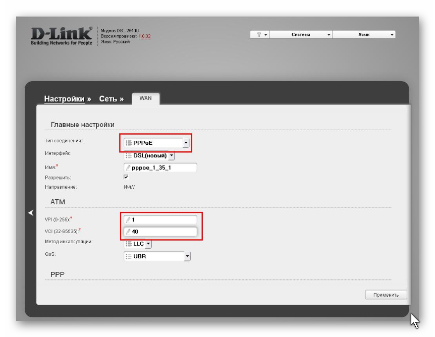 VCI – 32; тип: PPPoE; Encapsulation Mode: LLC/SNAP-BRIDGING; Username и Password узнайте у провайдера;
