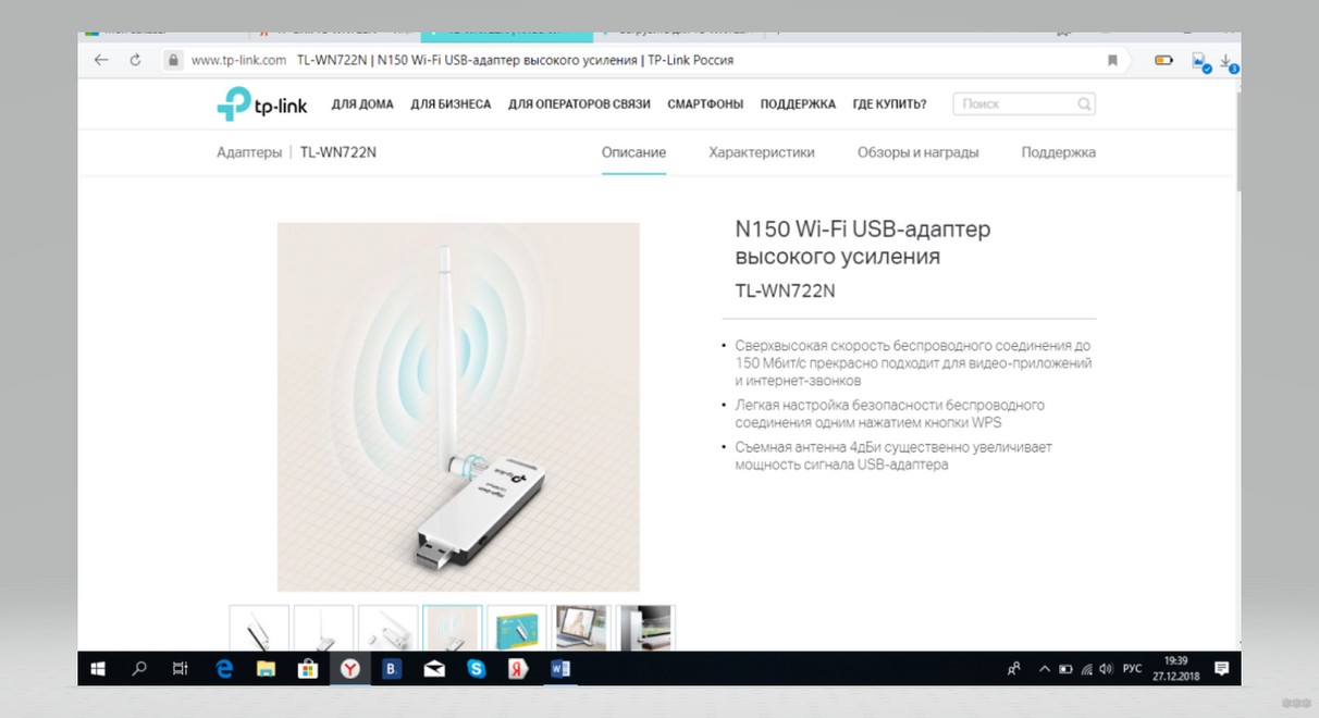 Для своего опыта я приобрел имеющийся тогда в продаже TP-LINK TL-WN722N с заявленной скоростью передачи данных 150 Мбит/с и внешней антенной для устойчивой работы. С его характеристиками и фотографиями можно ознакомиться тут.