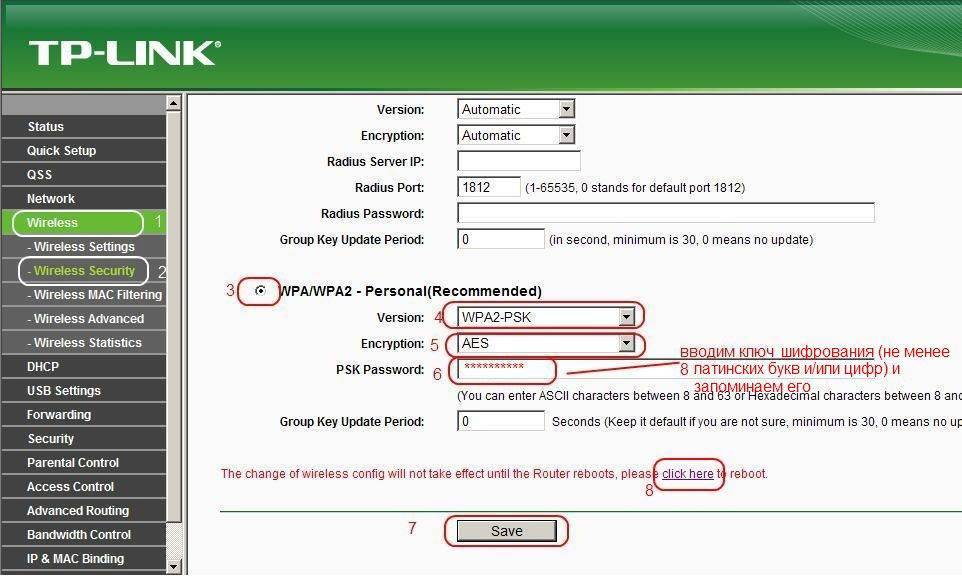 Перейдите на вкладку «Защита беспроводного режима» (Wireless Security). Выделите пункт «WPA/WPA2 — Personal (рекомендуется)», выставьте параметры версии и шифрования, как на скриншоте ниже, и в поле «Пароль PSK» придумайте и запишите пароль, который будет использоваться для защиты вашей Wi-Fi сети. Пароль должен быть минимум 8 символов.