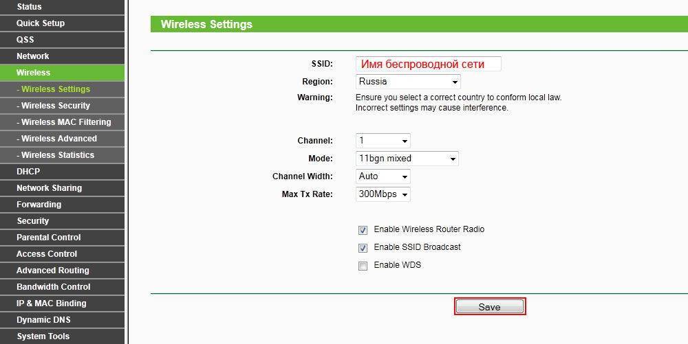 Перейдите на вкладку «Беспроводной режим» (Wireless). Здесь нужно сменить название Wi-Fi сети (SSID), и указать регион. Для сохранения настроек нажимаем на кнопку «Сохранить» (Save).