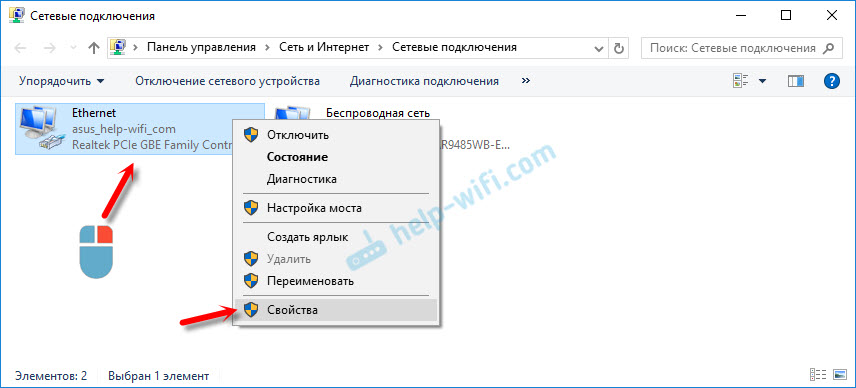 Если подключение по Wi-Fi, то нажимаем правой кнопкой мыши на «Беспроводная сеть» (Беспроводное сетевое соединение). Если же подключение по кабелю, то нажимаем на «Ethernet» (Подключение по локальной сети). Выбираем «Свойства».
