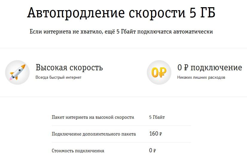 - Дешевый тариф от Beeline редко располагает большими пакетами трафика и высокой скоростью, поэтому стоит активировать опцию «Автопродление скорости». Стоимость 5 гигабайт – 150 рублей. Подписка работает только в России.