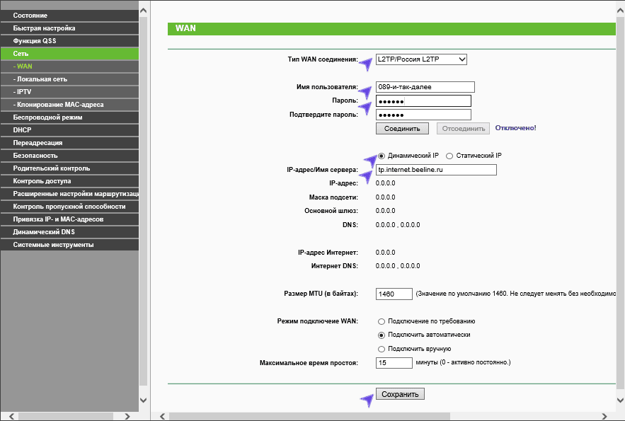 - В пункте «VPN сервер» нужно прописать tp.internet.beeline.ru для L2TP.