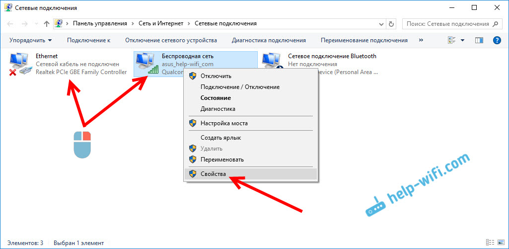 Откройте окно «Изменение параметров адаптера», нажмите правой кнопкой мыши на один из адаптеров: «Ethernet», или «Беспроводная сеть», смотря как у вас подключен интернет (кабель, или Wi-Fi). Выберите «Свойства».
