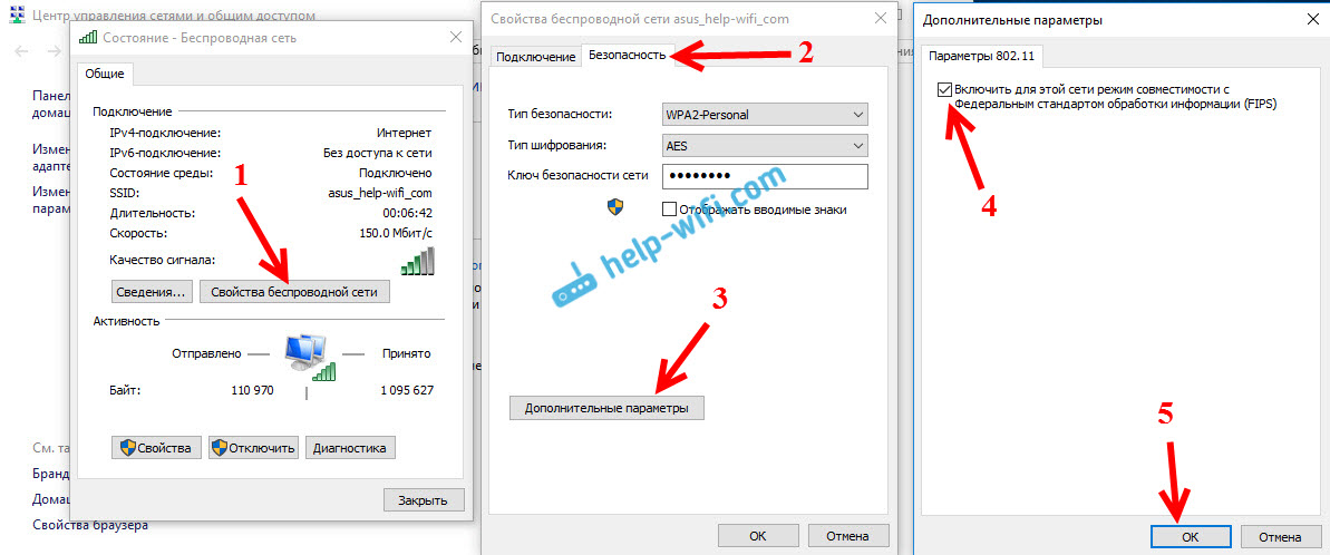 В новом окне нажимаем на кнопку «Свойства беспроводной сети», дальше переходим на вкладку «Доступ», и нажимаем на кнопку «Дополнительные параметры». Ставим галочку возле «Включить для этой сети режим совместимости с Федеральным стандартом обработки информации (FIPS)». И нажимаем на всех окнах кнопку Ok.