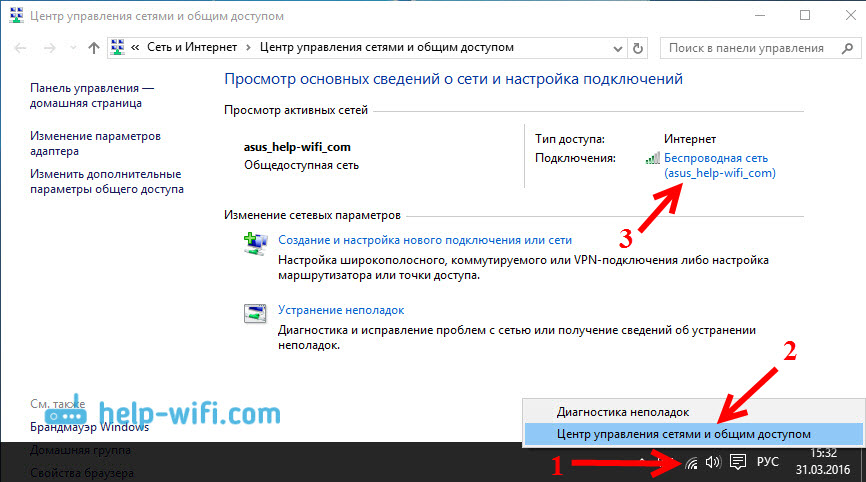Нажмите правой кнопкой мыши на значок подключения к интернету, и выберите «Центр управления сетями и общим доступом». В открывшемся окне, нажмите на ссылку с названием вашей Wi-Fi сети. Как на скриншоте ниже.
