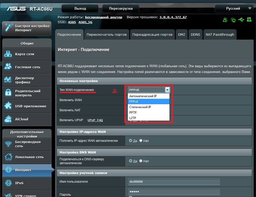 В строке «Тип подключения» выбираем тип, который использует Ваш провайдер. В большинстве случаев (Ростелеком, Дом.ru, ТТК) — это протокол PPPoE