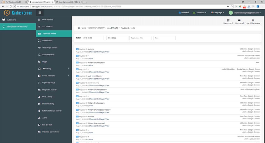 Это не программа для всестороннего отслеживания действий на компьютере. Это keylogger или клавиатурный шпион для отслеживания нажатий клавиш с несколько расширенным функционалом. Например, софт способен записывать текст из буфера обмена. Сайты и приложения он блокировать не умеет, но фиксирует время их открытия/запуска.
