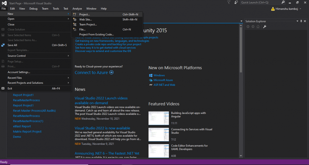 - After successfully installation of SSDT tools and authoring extension of CRM dynamics open the visual studio and click to new file-> new project.