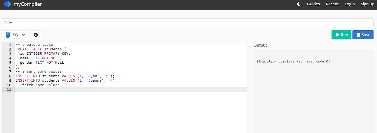 Применим на практике. Чтобы не создавать базу данных, зайдем в онлайн-компилятор mycompiler.io.