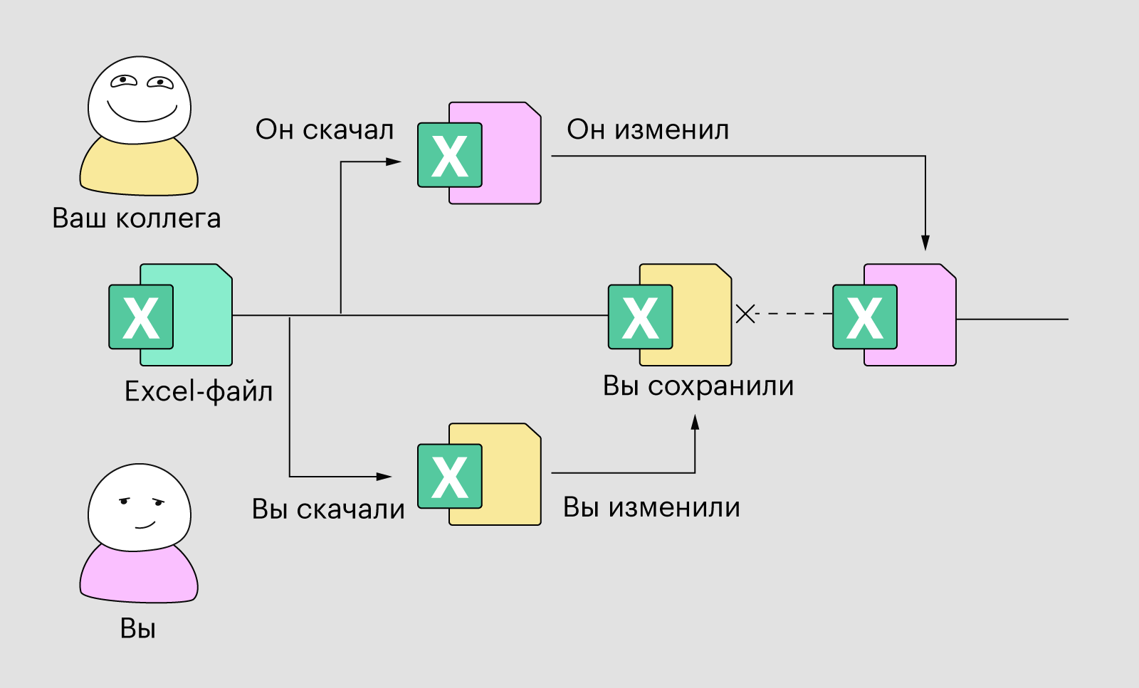 Вот вы садитесь за работу, открываете эту таблицу и вносите в неё какие-то изменения. Параллельно с этим ваш коллега тоже открыл её и начал вносить изменения — причём в те же колонки или строки, в которых работаете вы. Вы доделали работу, сохранили файл и закрыли его. Данные перезаписались в таблицу. Но ваш коллега не увидит эти изменения, потому что он открыл файл раньше. Поэтому когда он сохранит свой файл, то перезапишет ваши данные своими, а ваши изменения пропадут.