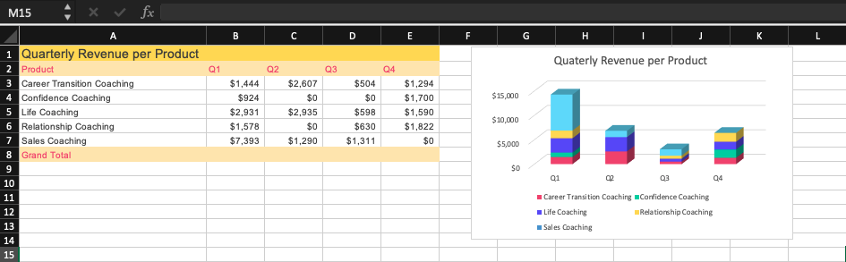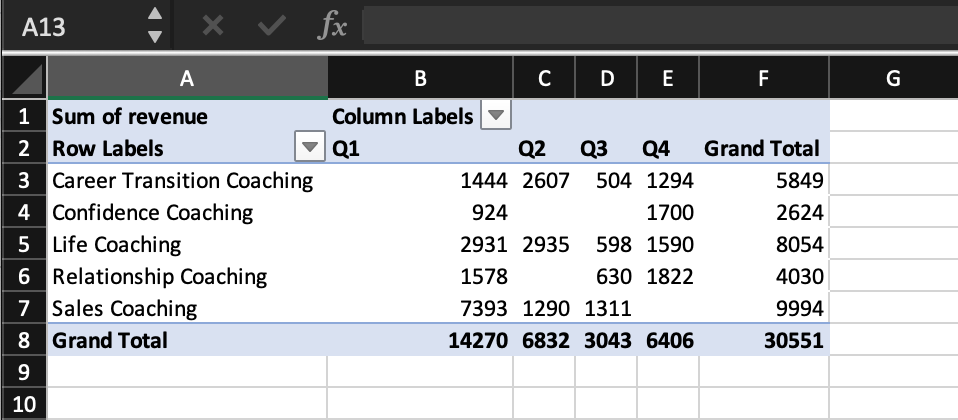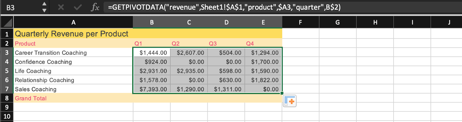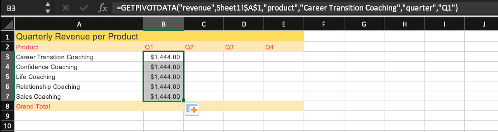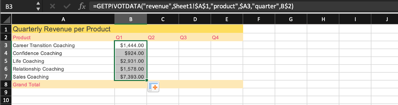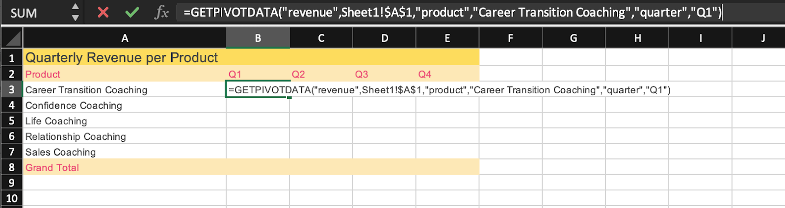 =GETPIVOTDATA(«revenue»,Sheet1!$A$1,»product»,»Career Transition Coaching»,»quarter»,»Q1″)