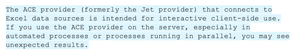 Поставщик ACE (прежнее название — поставщик Jet), который подключается к источникам данных Excel, предназначен для интерактивного клиентского использования. Если поставщик ACE используется на сервере SQL Server, особенно в автоматизированных процессах или процессах, выполняющихся параллельно, вы можете получить непредвиденные результаты.