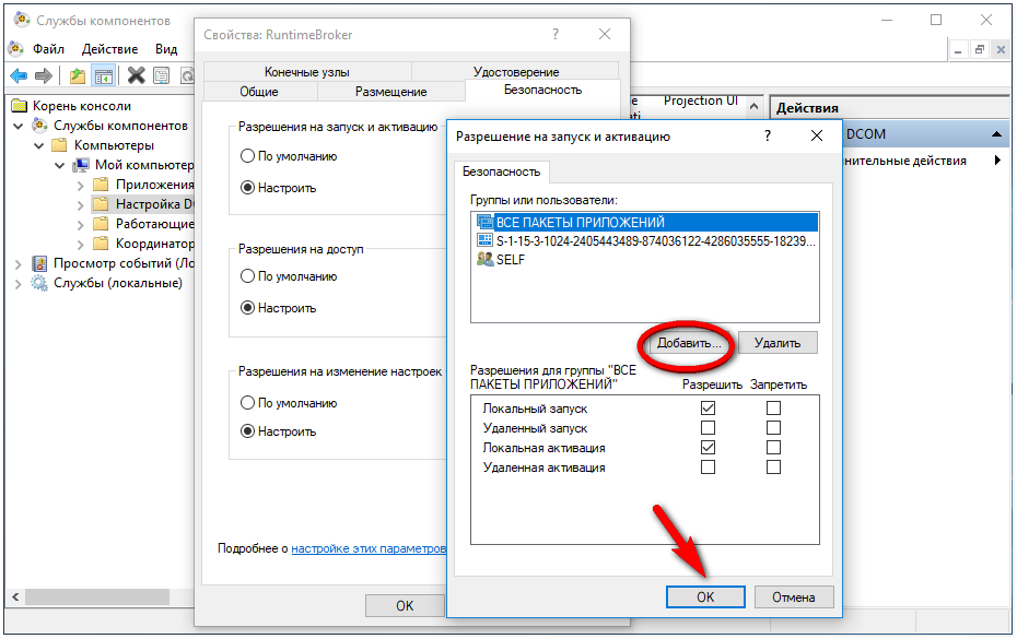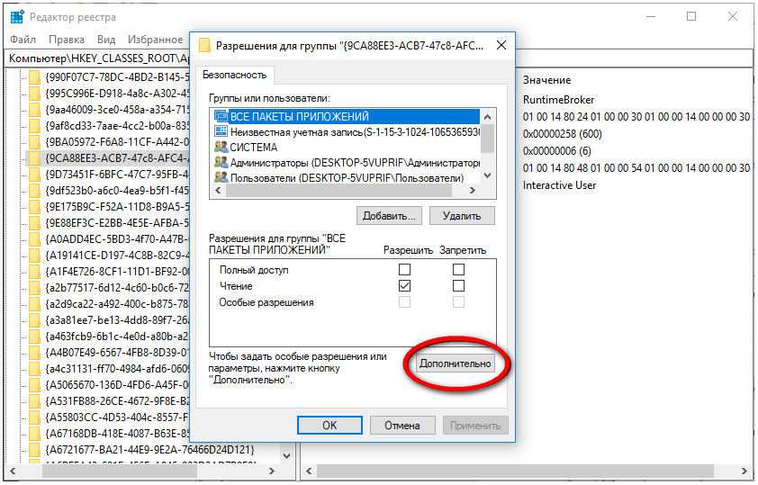Проделайте с ним те же манипуляции по замене владельца на Администраторы с предоставлением полных разрешений. Половина дела сделано, осталось только изменить разрешения для самого COM-объекта. Которым, как уже было определено, является RuntimeBroker.