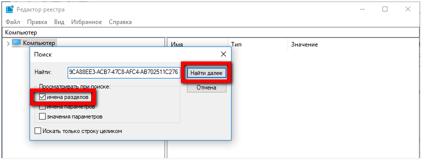 - Введите в поле поиска свой CLSID ключ, который типа Поставьте галочку искать только «имена разделов».