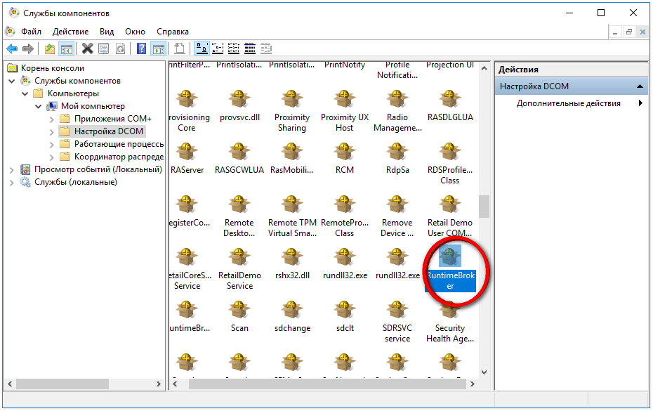 Перейдите по следующему пути Службы компонентов >Компьютеры >Мой компьютер >Настройка DCOM > и найдите в списке RuntimeBroker.