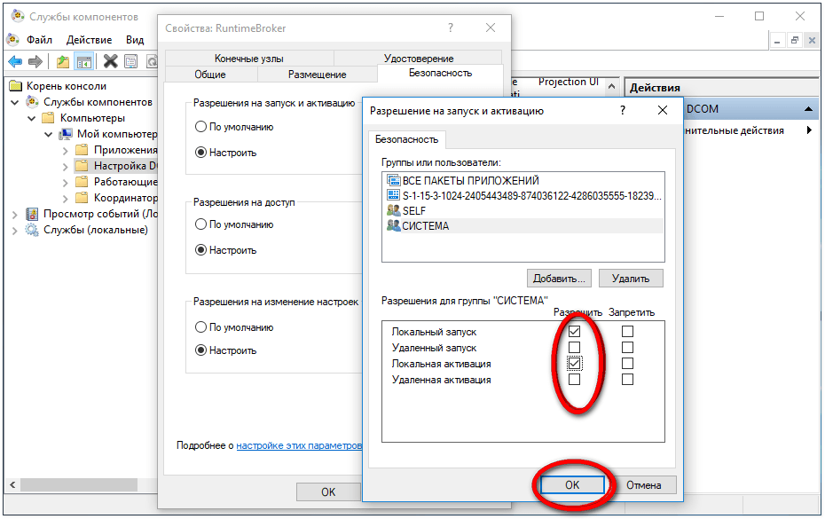 Найдите и добавьте пользователя СИСТЕМА, который также упоминался в описании ошибки. Предоставьте ему права на локальный запуск и на локальную активацию. После чего последовательно сохраните все настройки и перезагрузите компьютер.