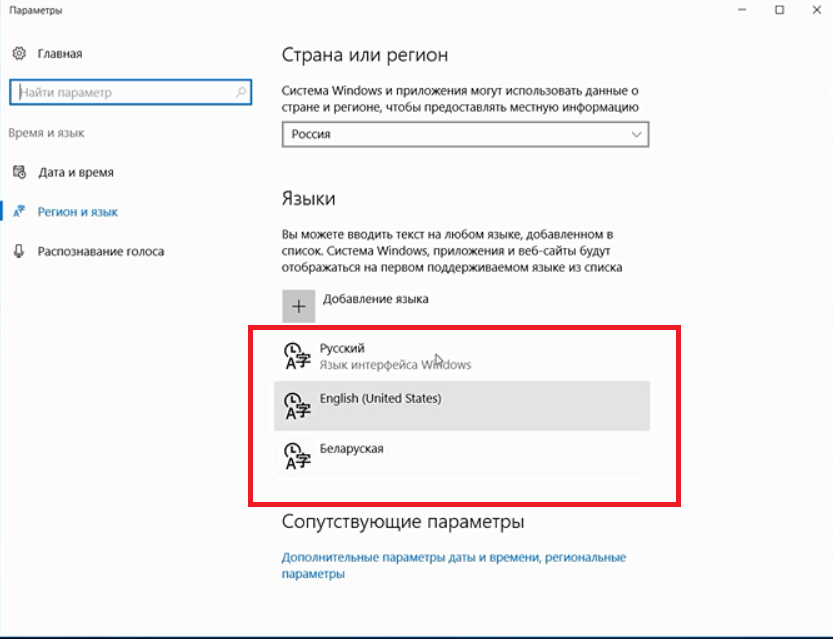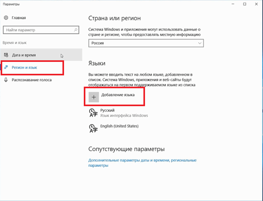 - Перейдите в раздел Время и язык — Язык или Регион и язык (Time & Language — Language или Region and language).