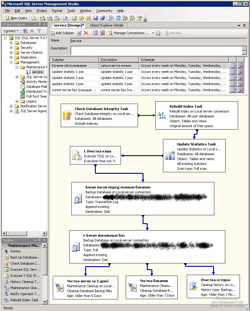 Итак, приведу свой пример настроенного Maintenance Plans с комментариями. Мой план состоит из 5 подпланов: