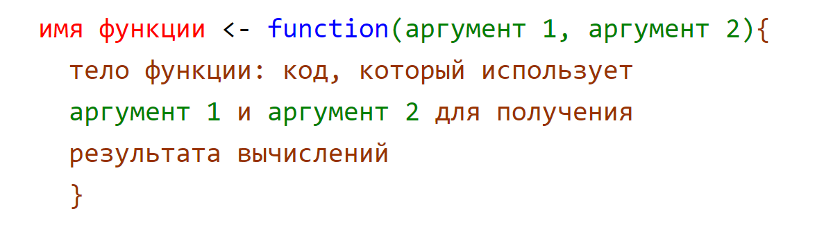 Зачастую во время анализа приходится выполнять одни и те же действия несколько раз, то есть, писать один и тот же код, где лишь незначительная его часть изменена. Однако гораздо практичнее будет оформить подобные массивы кода в функцию. В этом случае блок кода, копируемый из раза в раз, будет телом функции, а места кода, которые Вы изменяете в этом блоке станут аргументами (параметрами) функции. Также у функции должно быть имя, чтобы ее можно было вызвать в среде R. Схема построения функции в R выглядит следующим образом: