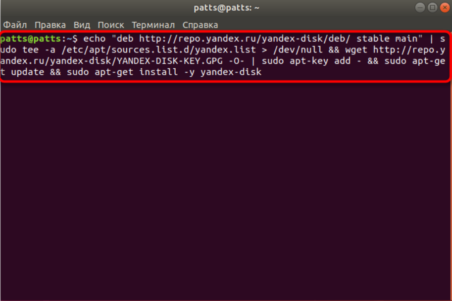 echo «deb http://repo.yandex.ru/yandex-disk/deb/ stable main» | sudo tee -a /etc/apt/sources.list.d/yandex-disk.list