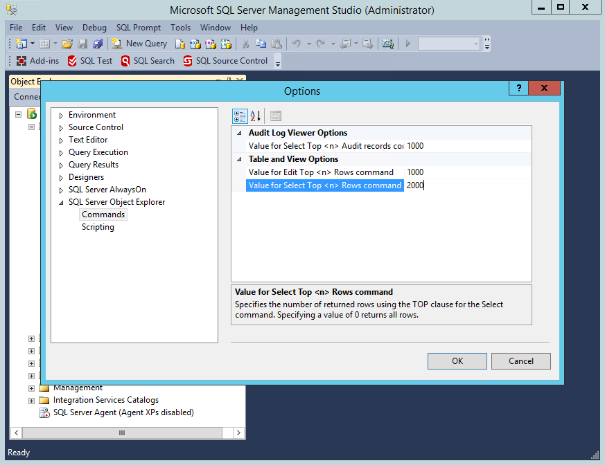 открыть вкладку «SQL Server Object Explorer» и в разделе «Table and View Options» установить необходимые значения. А если поставить 0, то будет выводиться все содержимое базы без ограничений.