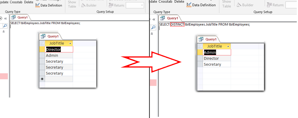 Глядя, чтобы сделать это без использования VBA и с помощью MS Access SQL. Вы знаете, что нужно перейти к дизайну запросов, а затем нажать кнопку SQL в правом нижнем углу. У меня есть некоторые.
