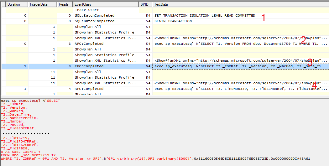 Начинается транзакция (1), читается версия объекта (2), читаются реквизиты объекта (3), читается первая табличная часть объекта(4)… Текст запроса показывает чтение всех реквизитов документа. Их слишком много, использовал пропуск.