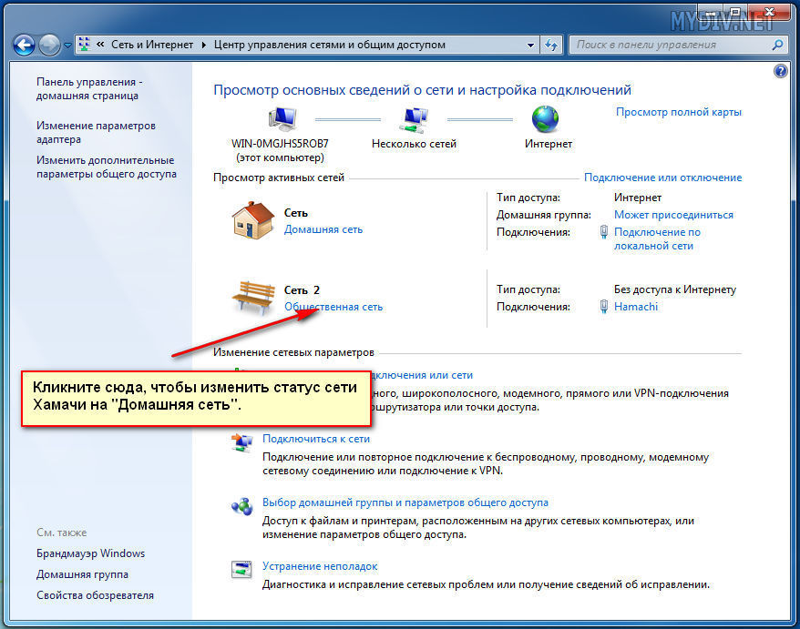 —> » и посмотрите на значок сети Хамачи, там должен быть изображен домик с надписью «Домашняя сеть», если это не так, то выберите вариант домашней сети).