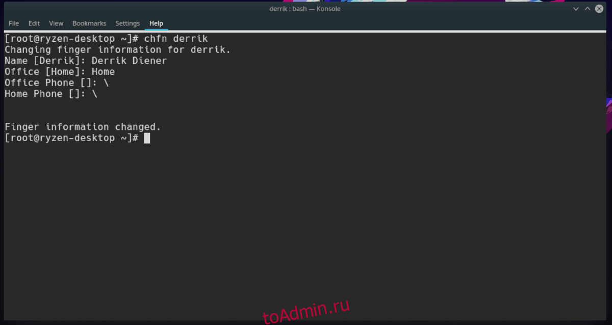 Шаг 2: Запустите команду chfn с нужным пользователем, которого вы хотите настроить рядом с ним.