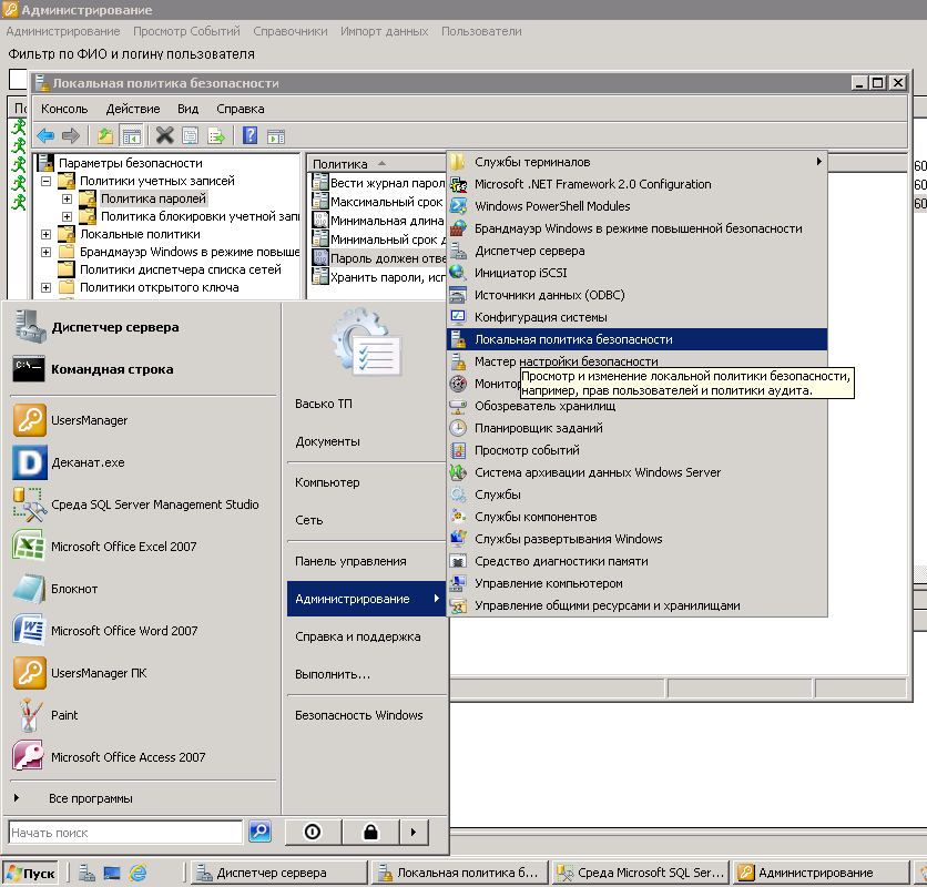 Если у Вас установлена Window Server любой версии, то откройте через меню «Пуск» — «Администрирование» — «Локальная политика безопасности».