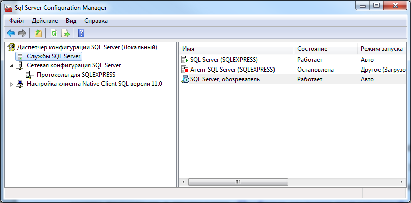 Во вкладке «Службы SQL Server» убедитесь, что служба «SQL Server, обозреватель» запущена. В колонке «Состояние» должно быть значение «Работает», а в колонке «Режим запуска» — «Авто». Также и для службы SQL Server (sqlexpress).