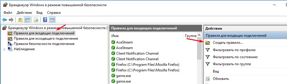3. Выберите узел «Правила для входящих подключений» и затем, в правой панели — Создать правило