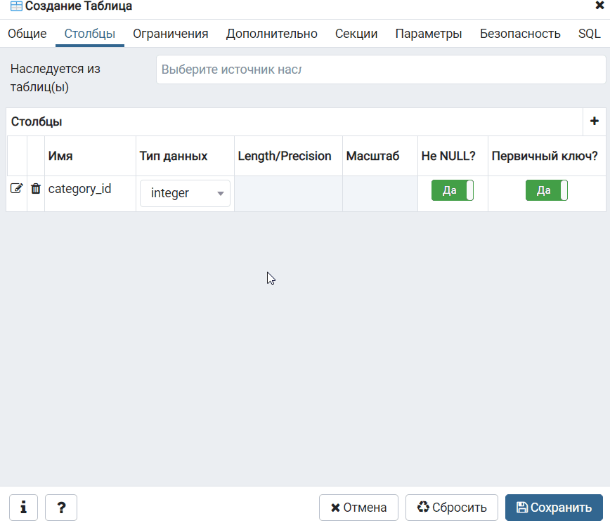 Сначала создаем идентификатор категории, по условиям нашей задачи он должен отвечать определенным требованиям, поэтому мы должны задать следующие свойства у столбца: