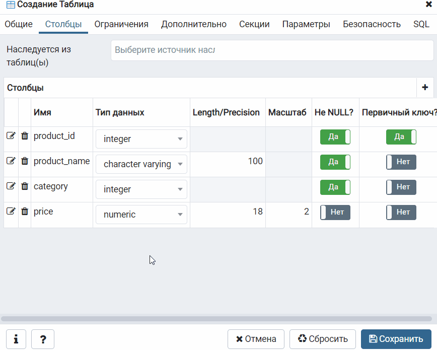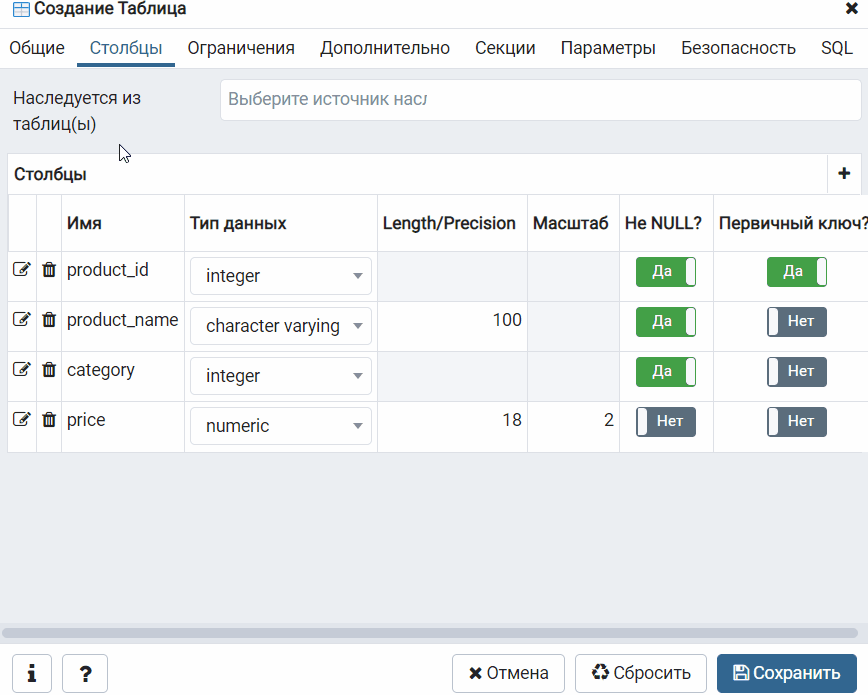 Создание таблицы с помощью графического конструктора pgAdmin 4