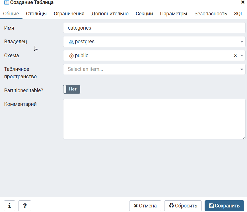 Затем запустится графический конструктор таблиц, где первым делом нам необходимо ввести название таблицы, сначала давайте создадим таблицу с категориями, чтобы потом в процессе создания таблицы с товарами у нас была возможность сразу определить ограничение внешнего ключа. Поэтому вводим categories.