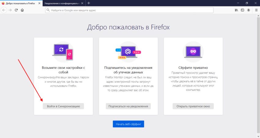 После первого запуска перед нами отображается окно приветствия, в котором нам предлагают синхронизироваться с другими устройствами, подписаться на уведомления или открыть приватное окно.
