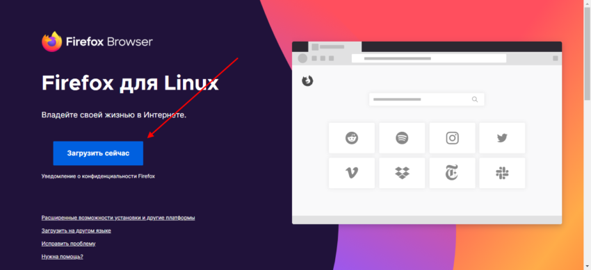 Открываем в любом браузере ссылку https://www.mozilla.org/ru/firefox/linux/ и на главном экране кликаем по кнопке «Загрузить сейчас». Затем выбираем место, куда будет загружен файл и переходим к установке.