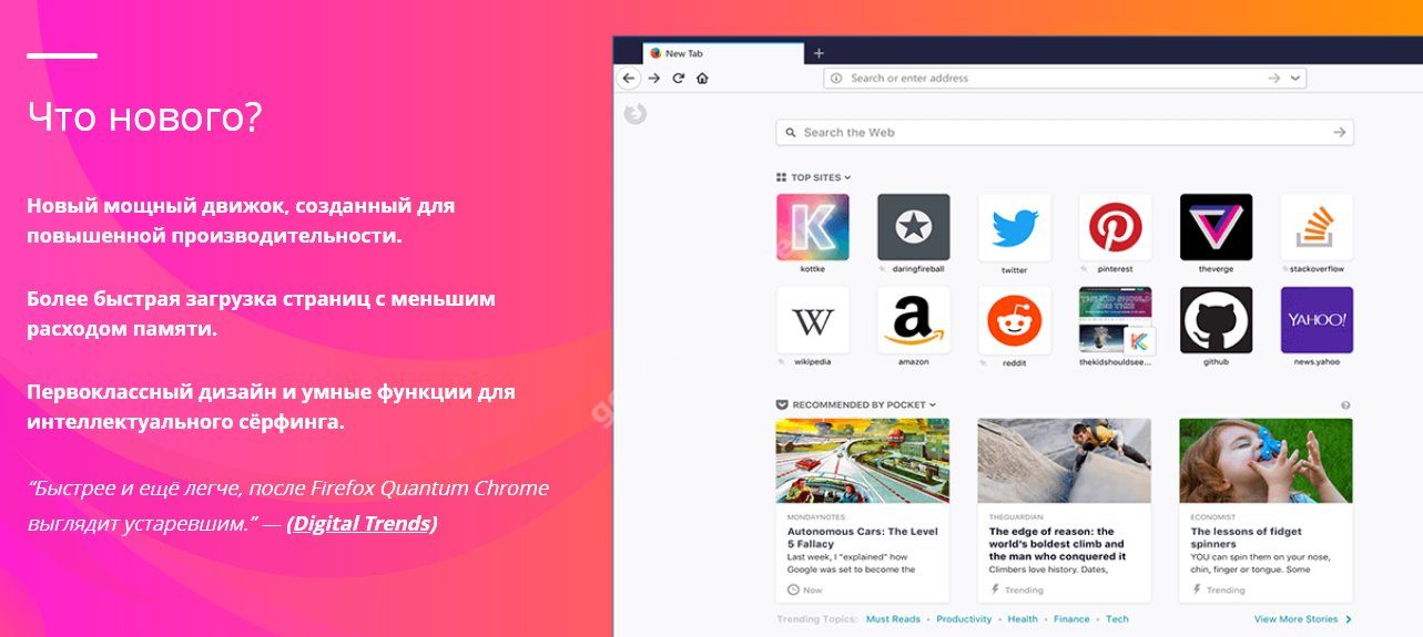 - Новый движок Огненного Лиса Firefox Quantum характеризуется многочисленными улучшениями и снижением нагрузки на железо ПК — потребляет меньше оперативной памяти и ресурсов ЦП;