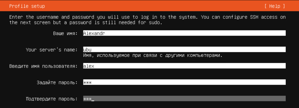 Соглашайтесь с такой разметкой диска и продолжайте установку ubuntu server 18. Далее вам нужно будет указать логин и пароль вашей учетной записи. Так как по-умолчанию в ubuntu не создается учетная запись root, заходить на сервер после установки вы будете под своей учетной записью.