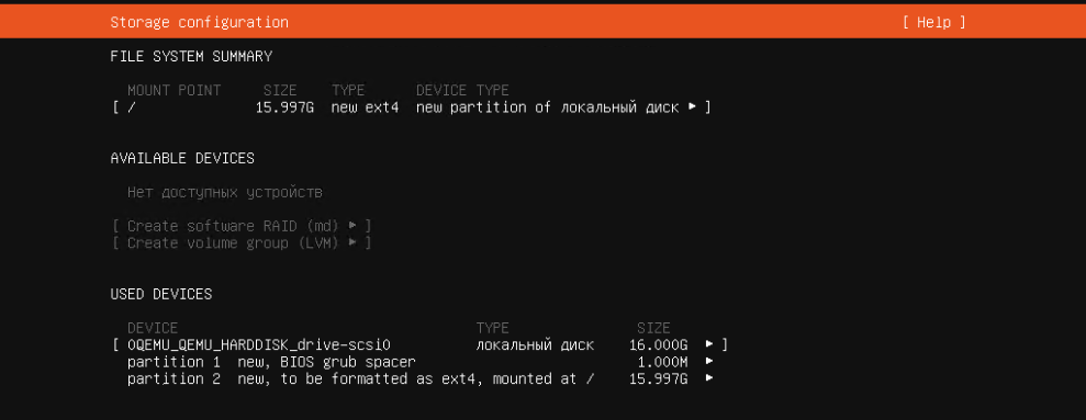 Далее выбираете свой диск и видите автоматическую разметку, которую предложил установщик ubuntu server для ssd диска в 10 Gb.