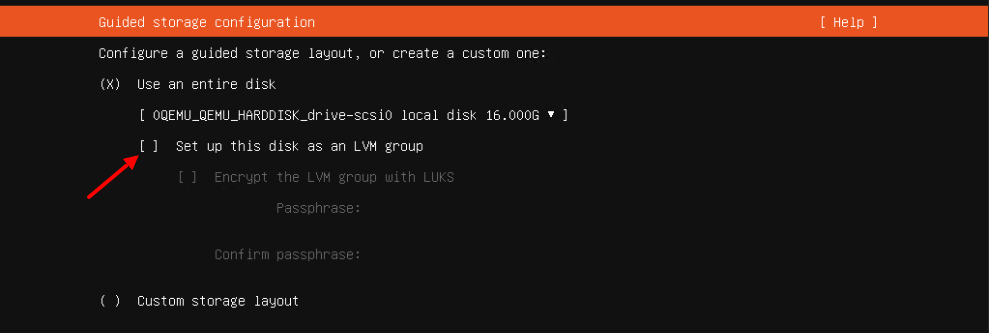 Итак, если вы решили использовать LVM, то на этапе с выбором разметки выбирайте — Use An Entire Disk And Set Up LVM.