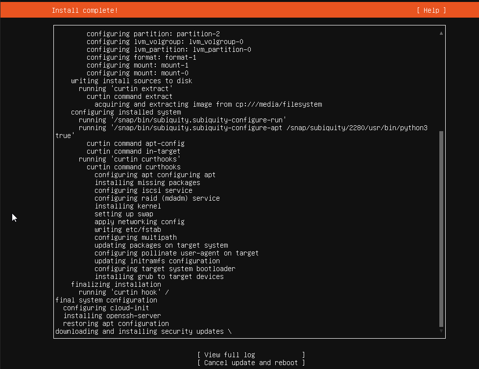 После этого пункта, начинается непосредственно установка Ubuntu Server 18 на сервер, которым в данном примере выступает виртуальная машина. Весь процесс скачивания и установки компонентов будет протекать перед вашими глазами в логе. Завершение процесса будет ознаменовано появлением сообщения — Installation Complete.